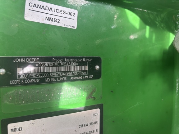 2024 JOHN DEERE 612R SELF PROPELLED SPRAYER, VF380/105R50 R1W, LSW800/55R46 GOODYEAR FLOATERS, 1200 GAL SS TANK, 120' BOOM, EXACT APPLY, SS PLUMBING, 5 SENSOR BOOMTRAC, SIGNATURE EDITION, ULTIMATE COMFORT & CONVENIENCE, ACTIVE SEAT II, FRONT FILL, TRACTION CTRL, STD PUMP, AUTO SOLUTION CONTROL W/PRESSURE RECIRCULATION & PRODUCT RECLAIM, BOOM AIR PURGE, ULTIMATE VISIBILITY, LH/RH FENCE ROW, REAR CAMERA, UNDERFRAME SHIELDS, 4 TRIDEKON CROP DIVIDERS, AMS: GEN 4 CC DISPLAY, EXTENDED MONITORM, PREM 3.0 ACT, INTEGRATED STARFIRE RECEIVER
