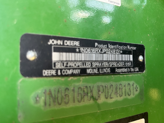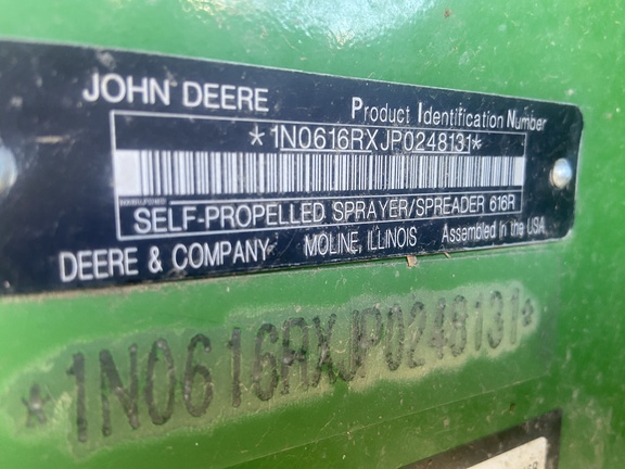 2024 JOHN DEERE 616R SELF PROPELLED SPRAYER, VF380/105R50 R1W, LSW800/55R46 GOODYEAR FLOATERS, 1600 GAL SS TANK, 132' CF BOOM, EXACT APPLY, SS PLUMBING, 5 SENSOR BOOMTRAC, SIGNATURE EDITION, ULTIMATE COMFORT & CONVENIENCE, ACTIVE SEAT II, FRONT FILL, TRACTION CTRL, STD PUMP, AUTO SOLUTION CONTROL, BOOM AIR PURGE, ULTIMATE VISIBILITY, LH/RH FENCE ROW, REAR CAMERA, UNDERFRAME SHIELDS, FLOATATION FENDERS, 4 TRIDEKON CROP DIVIDERS W/AIR, PT POWERGARD EXPIRES APRIL 19 2029 OR 2500 HOURS - $500 CAD DEDUC, AMS: GEN 4 4600 CC, EXTENDED MONITOR, PREMIUM 3.0, INTEGRATED STARFIRE RECEIVER, MOBILE WEATHER W/ACTIVATION