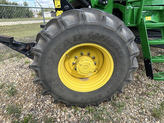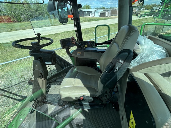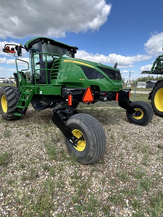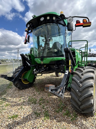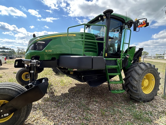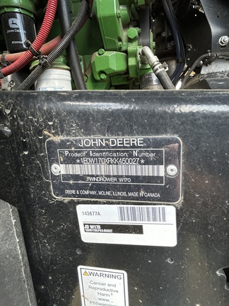 2019 JOHN DEERE W170 WINDROWER W/ 1440D DRAPER PLATFORM, 600/65R28 RADIAL TIRES, 16.5L-16.1 FORKED CASTERS, CENTERLINK SELFALIGNMENT KIT, HVY DUTY BOOSTER SRINGS, INITIAL REAR BALLAST PACKAGE, SWATH COMPRESSOR, DOUBLE DRAPER DRIVE KIT, END FINGER KIT FOR PU REEL AND STABILIZER WHEELS SLOW SPEED